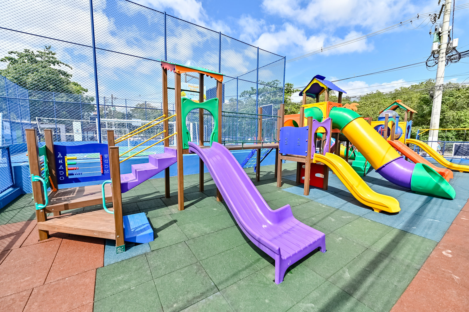 Além da requalificação do parque, o paisagismo totalmente renovado trouxe mais verde e harmonia ao espaço, reforçando a sensação de acolhimento e tornando o ambiente ainda mais agradável. O campo de grama sintética, já conhecido e muito utilizado pela comunidade, agora é complementado com uma nova área de convivência, que conta com bancos e locais para encontro das famílias.